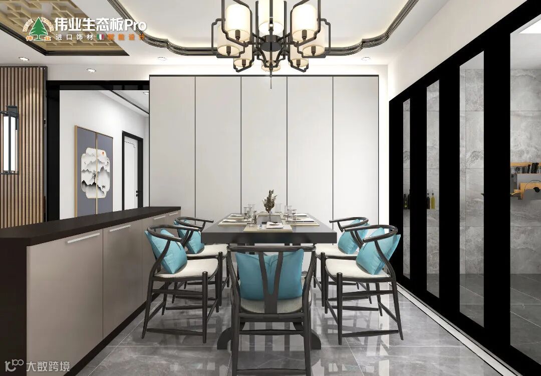 餐边柜内嵌进墙,全封闭设计,避免落灰。中式条形餐桌+太师餐椅,简中有繁,稳重又精致。