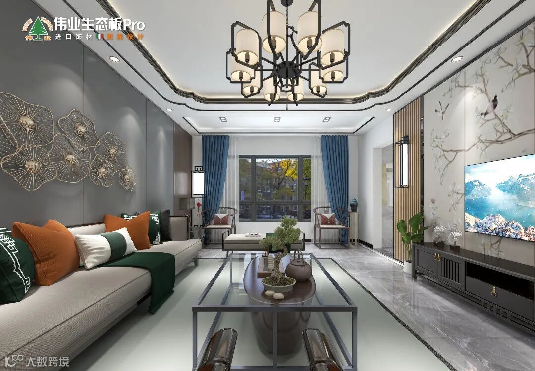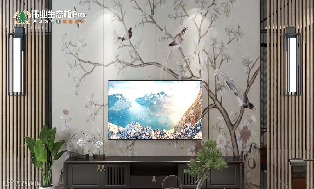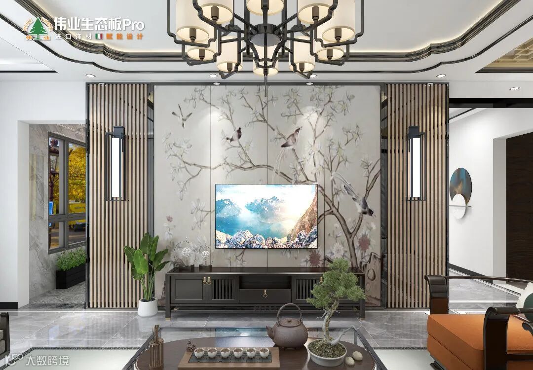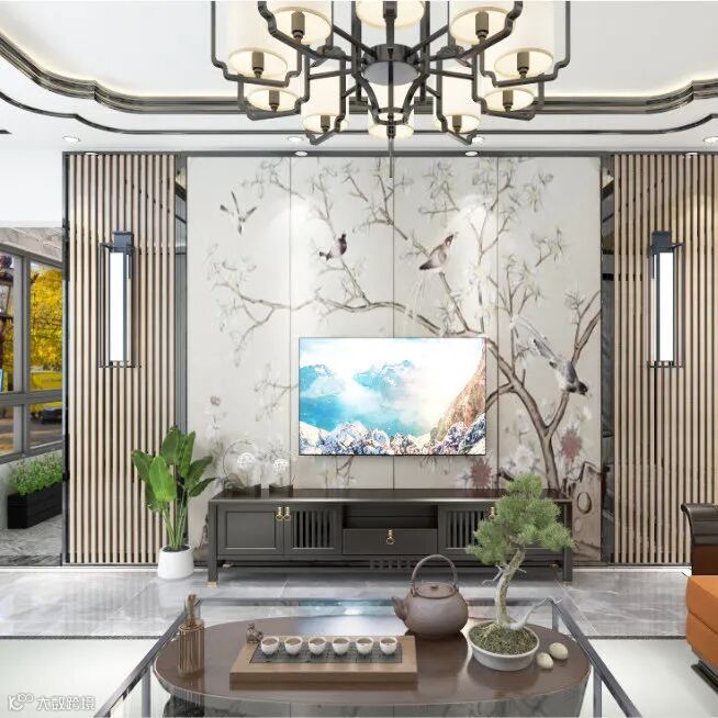国人讲究待客之道,栅格+水墨画打造古风电视墙,意境深远,超然大气。