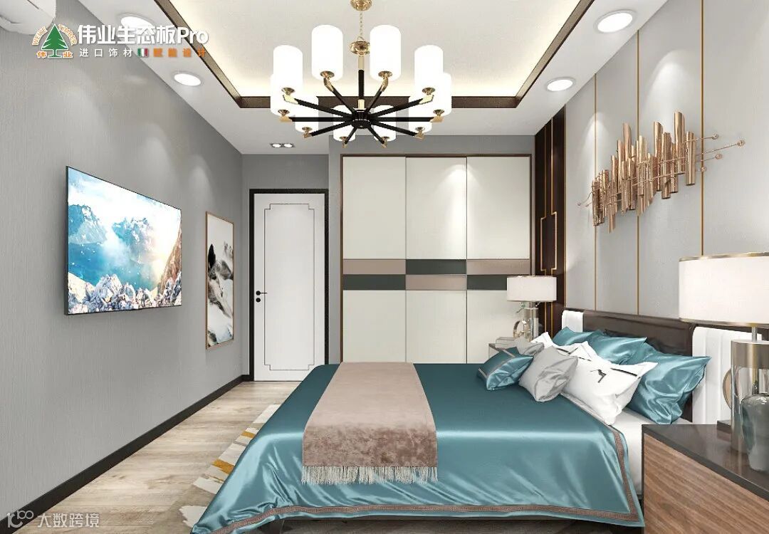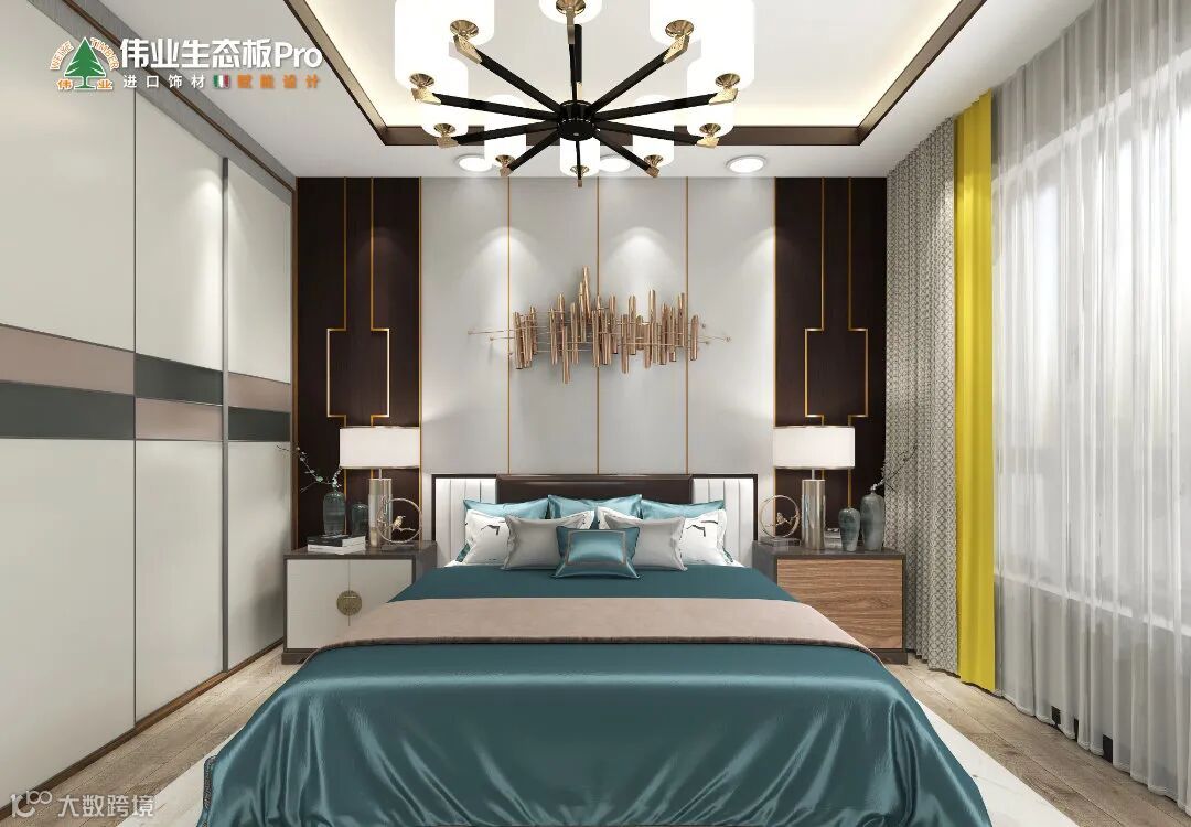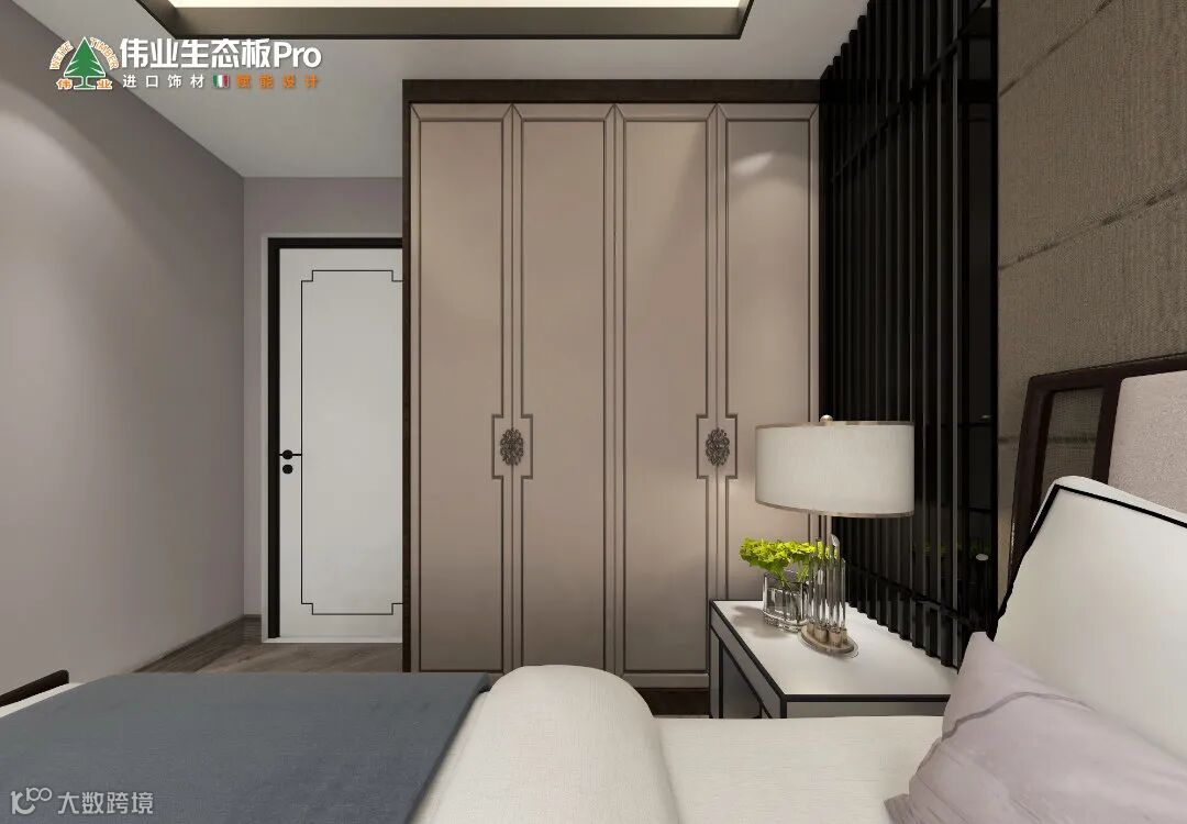 用内敛的低饱和色调,统一空间视觉。床头墙是方块组合+黑金栅格,营造秩序观感。