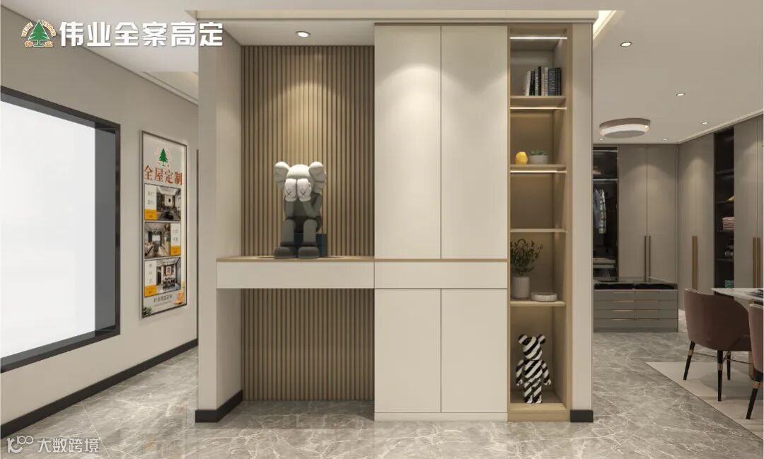 玄关柜是一体式+到顶设计,获得超大扩容收纳空间,打造家庭收纳的“半壁江山”。局部中空+展台,摆放装饰品小物件做点缀,既能收纳又美观。