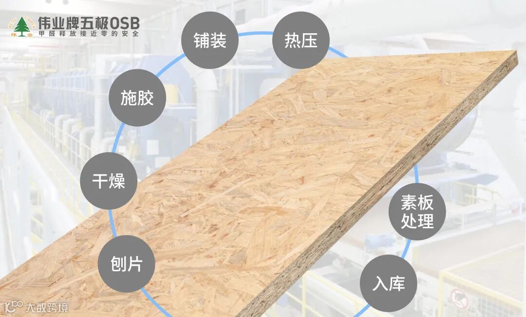 伟业牌五极OSB建立智能生产工厂,引进德国工业4.0先进设备,实现自动化、智能化制造,每一张OSB均经过刨片→干燥→施胶→铺装→热压→素板处理→入库等工艺,每一道工艺均由数据监测,成品伟业牌五极OSB的品质系数远超国家标准。