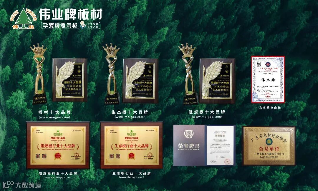 伟正木业始于1996年,凭借专业、材料、环保、渠道、服务5大品牌优势,“伟业牌”发展为行业一线品牌,系列产品畅销全国,荣获“板材十大品牌”、“粤港澳大湾区品牌100强”、“生态板十大品牌”等称号。
