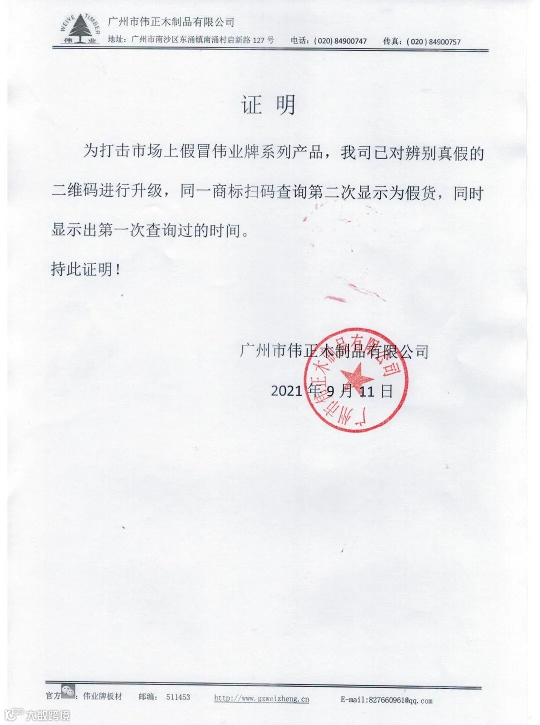 随着“伟业牌”的知名度逐步提升,市场中不断出现假冒的伟业牌系列产品,既严重危害消费者的权益,也损害伟正木业的品牌形象。为此,伟业牌板材的防伪标签已全新升级,关于产品扫码查询现作以下证明: