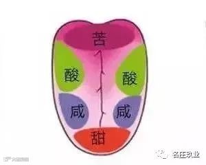 嗯,下面这张丑爆了的图是人体舌头的4个味觉区域。我们对葡萄酒的品尝通常是通过鼻子和舌头,鼻子是闻香,舌头是尝酒。舌尖对甜味最敏感,舌面中前部对咸味敏感,舌面后部对苦味敏感,舌头的两侧则对酸度敏感,大家可以在日后品酒时多加感受。
