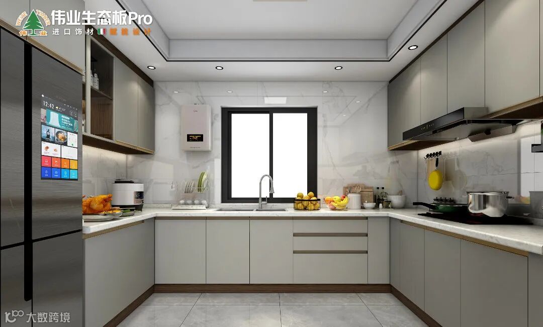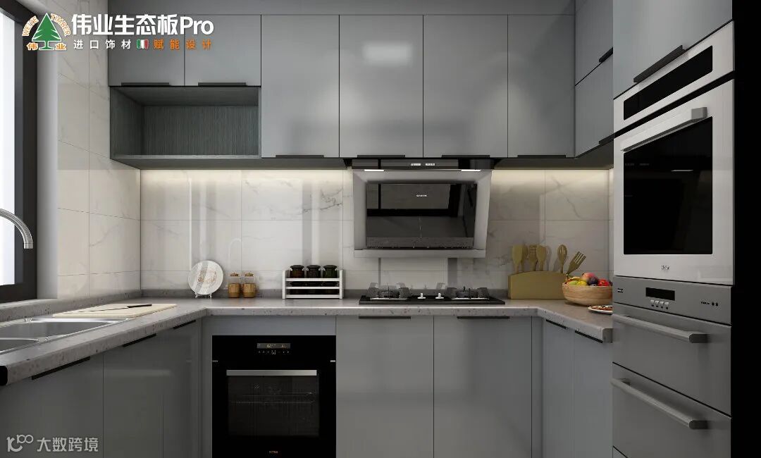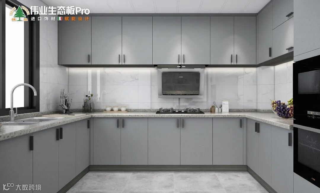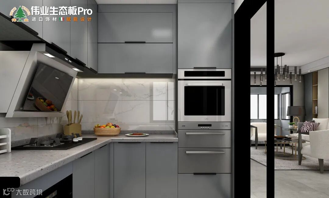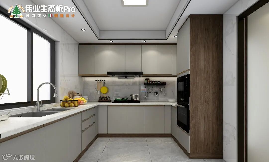厨房空间较大,沿墙做U型橱柜,家用电器直接嵌入柜体中,减少空间浪费,储物区、洗涤区、备菜区、烹饪区连贯紧凑,灰色的柜门、木色的柜体,让“净”和“简”立刻呈现。
