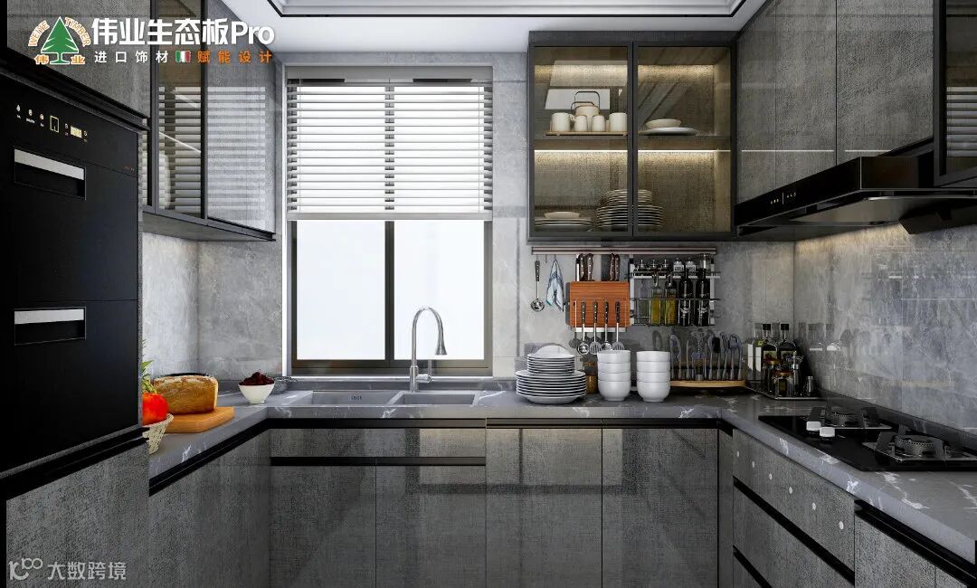 U型地柜+吊柜,高光的饰面、精致的质感,搭配着黑色的金属橱具,让本该热火朝天、百味陈杂的厨房,褪去燥热和辛辣,还原生活最本真的味道。