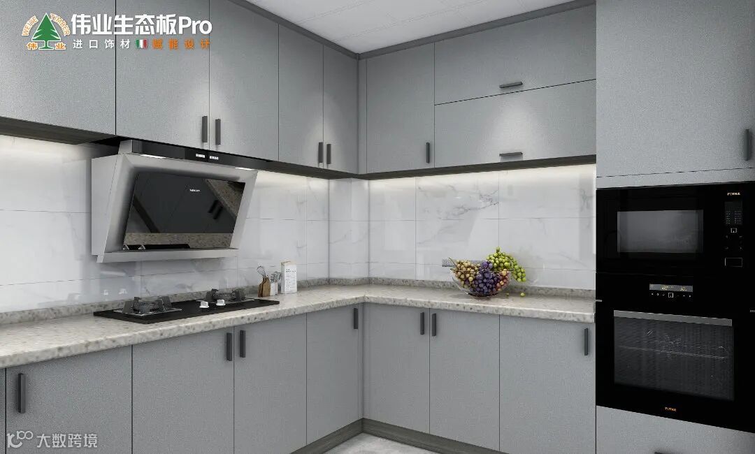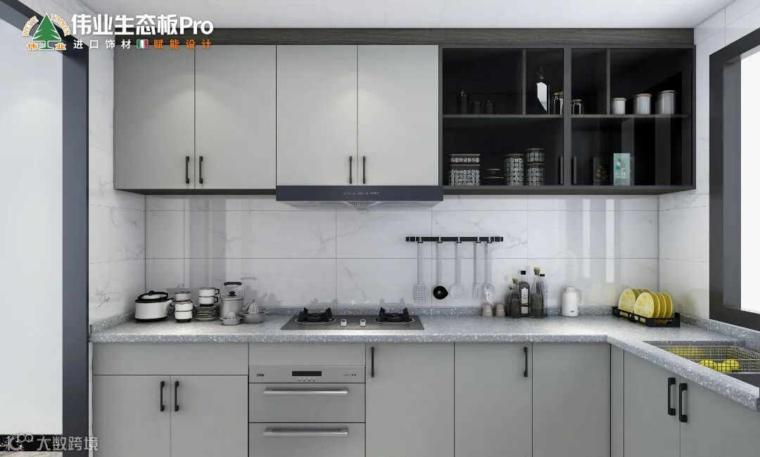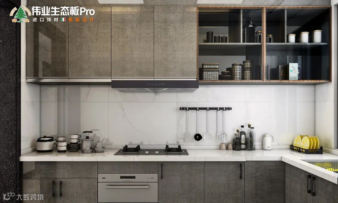 高级灰的基调干净温和,搭配纹理清晰的辅助花色,空间质感瞬间提升,添加黑金拉手元素、大理石的台面,以简洁的表现形式,保留最本真的空间属性。