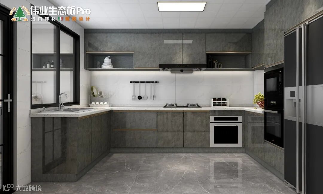 整体以灰色为主,利用黑色金属拉手增加精致感,简洁的现代线条、素雅的灰色色调,冲淡厨房“烟火气”的油腻,让质朴自然与精致现代完美融合。