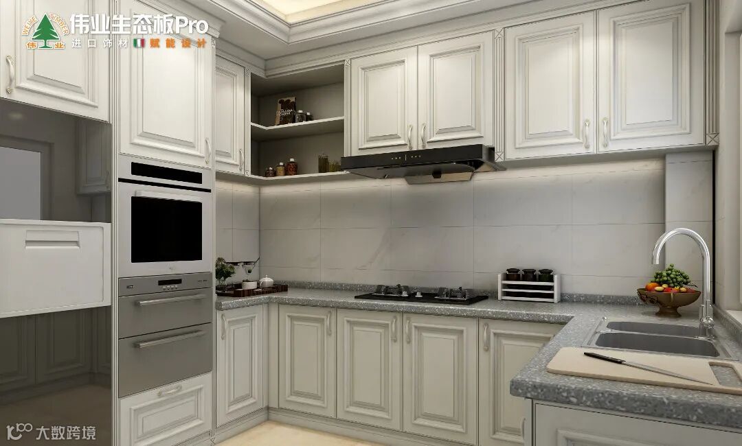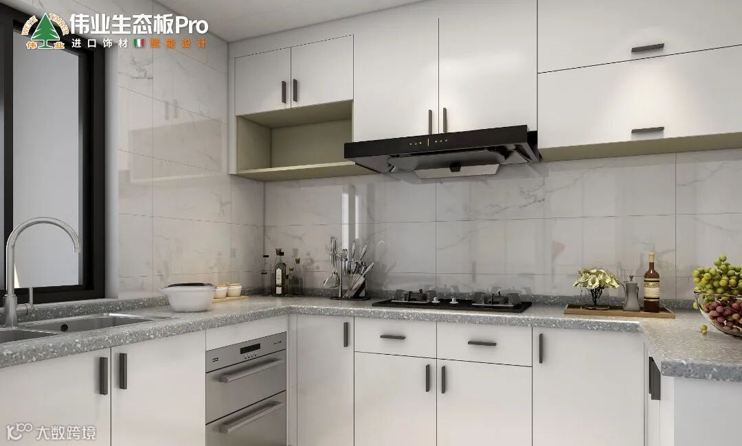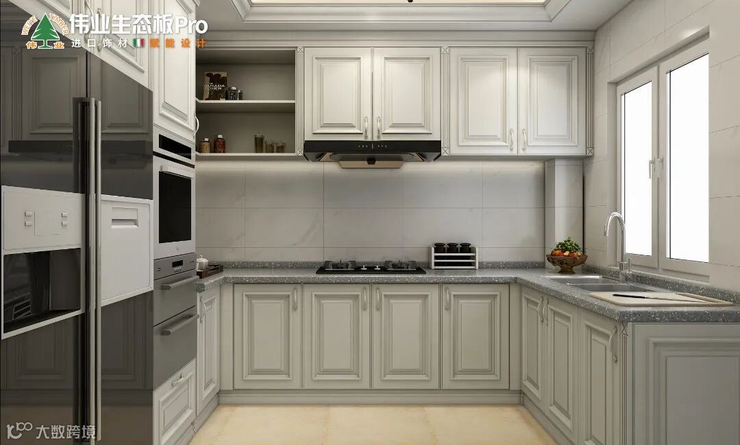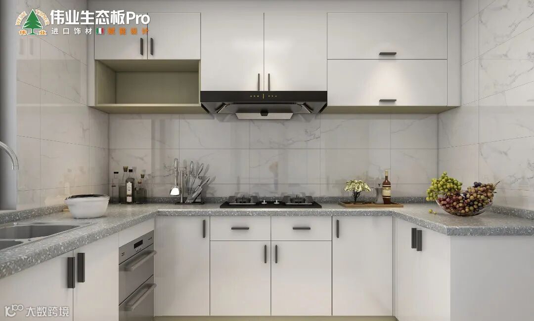 U型橱柜三面靠墙,动线布局合理,科学划分清洗区、备菜区、烹饪区、储藏区,白色的橱柜+灰色的大理石台面,干净规整、简洁温馨,拒绝凌乱和油腻,带给素雅干净的厨房生活体验。