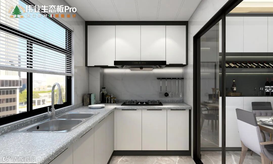 做U型设计,形成“清洗-备餐-烹饪”连贯三角区,操作空间从容有序,橱柜的色彩则是融合白色的纯净、黑色的凝练、灰色的调和,为空间颜值加分,轻松打造厨房的高级感。