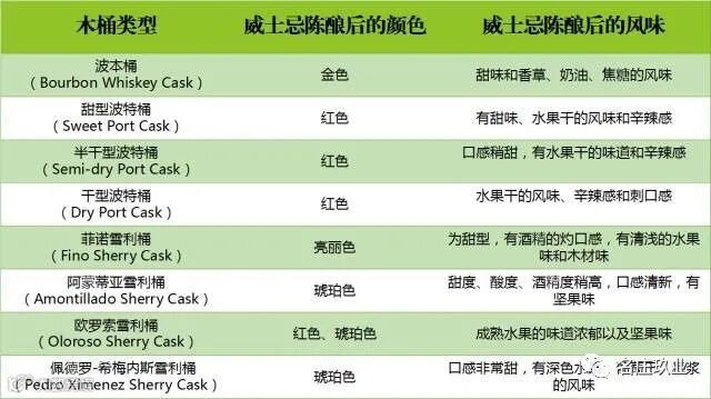 我们都知道苏格兰威士忌必须在橡木桶中陈酿至少 3 年,而不同类型的橡木桶能赋予威士忌不同的风味。苏格兰威士忌常用的木桶类型包括雪利桶(Sherry Butt)、波本桶(Bourbon Cask)、波特桶(Port Wood)等。有些威士忌酒标上会标明经过哪种橡木桶的桶陈(Mature/Age/Finish),有些则会写上“三桶”(Triple Wood/Cask,经过 3 种橡木桶的陈酿)或“双桶”(Double Wood/Cask,经过 2 种橡木桶的陈酿)。