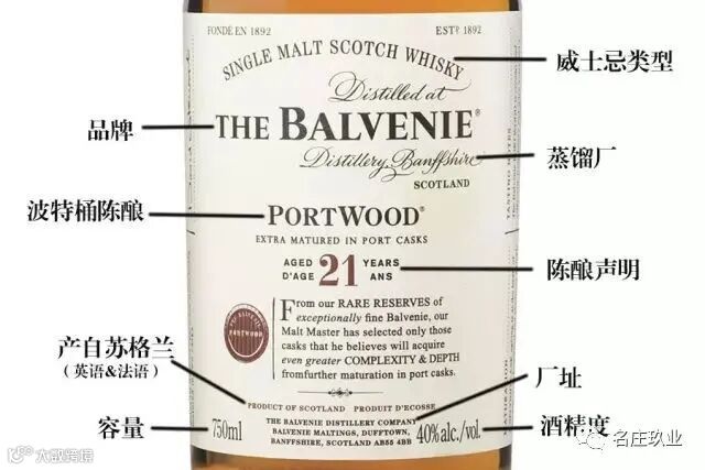 酒标上往往用最大的字体写明品牌。大多数苏格兰威士忌的品牌名都与酒厂名一致,所以比较直观。不过,苏格兰目前有 100 多家威士忌蒸馏酒厂,比较畅销的品牌有尊尼获加(Johnnie Walker)、百龄坛(Ballantine's)、芝华士(Chivas Regal)、格兰特(Grant’s)、珍宝(J&B)等。此外,还有一种被称为独立装瓶厂(Independent Bottler)的厂家,通过购买蒸馏厂的威士忌酒液后自行调配装瓶。在这种情况下,酒标上会出现装瓶厂的名字和蒸馏厂的名字。