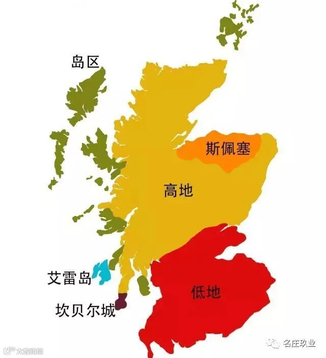 酒标上往往会标明威士忌来自苏格兰的哪个地区。苏格兰威士忌有自己的产区地图,主要分为高地(Highland)、斯佩塞(Speyside)、艾雷岛(Islay)、低地(Lowland)和坎贝尔城(Campbeltown)。除此之外,有人认为还可以独立划分出一个产区,即岛区(Island)。但目前还没有获得苏格兰威士忌协会(Scotch Whisky Association,简称 SWA)的承认,因而被认为是属于高地产区的一部分。不同产区的苏格兰威士忌有不同的风格,具体如下: