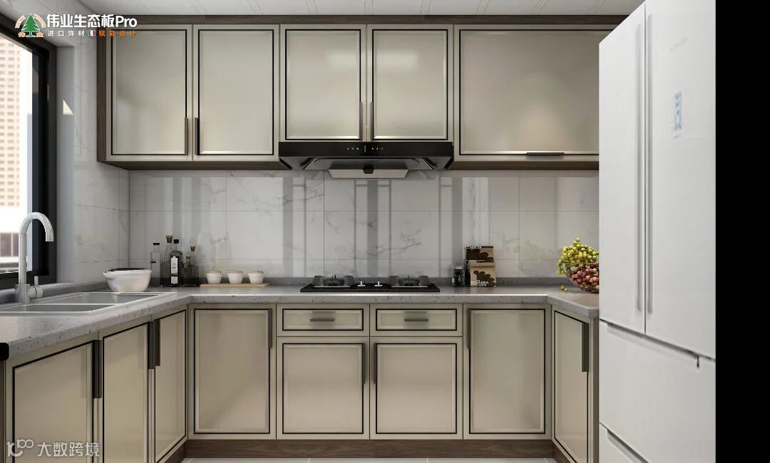 厨房和餐厅相连,U型橱柜利用厨具环绕三面墙壁,炉具、水槽、和冰箱形成一个正三角,满足家庭烹饪的需求,增加方形吸顶灯,点燃空间的高级感,让厨房不再是炒热朝天的柴米油盐气。