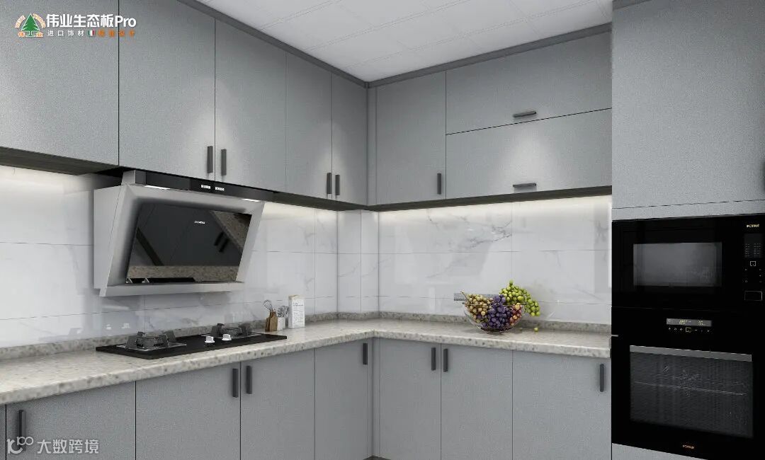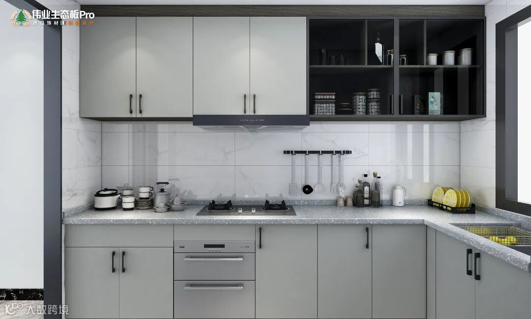 长廊型的厨房设计成L型橱柜,打造水槽-操作台-灶台的布局,形成“洗-切-炒”功能区,操作动线更流畅,整体灰色调的橱柜,耐看又耐脏,搭配黑色金属拉手,共同打造冷艳轻奢风的厨房。