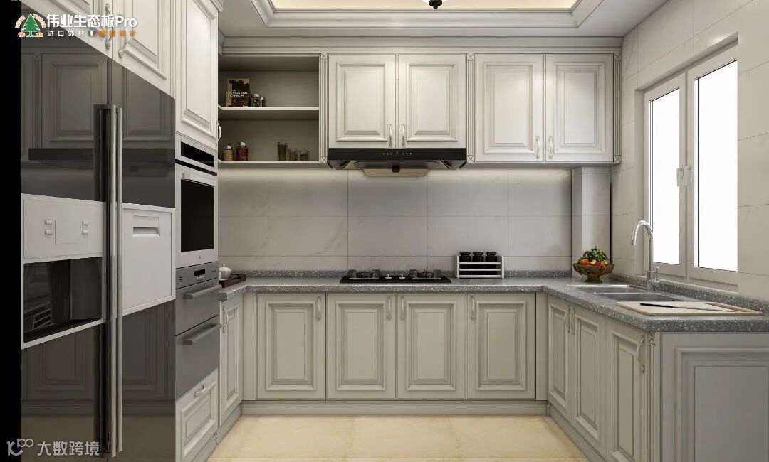 厨房布局方正,U型橱柜动线流畅,以暖白为基调,搭配灰色大理石台面、白色的拉手、复古的地砖,轻松勾勒出空间的层次感和品味,整体高雅却不张扬,奢华却不累赘,让厨房弥漫着欧式情怀,又不失摩登内涵。
