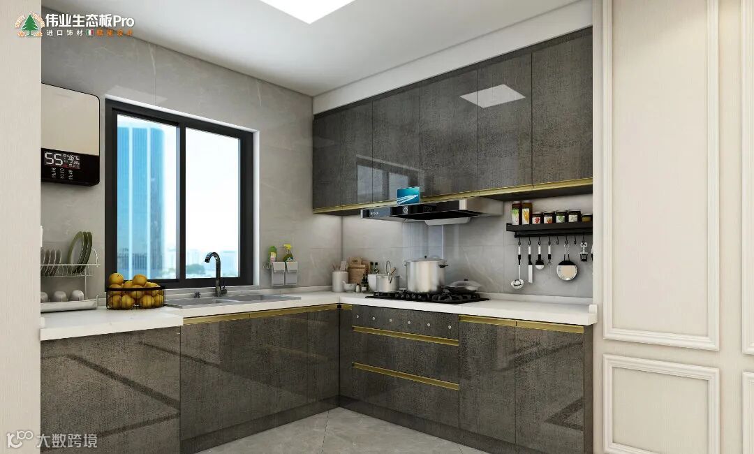 灰色基调的厨房,整体高级、干净,辅以深色的柜体板,形成递进的色彩视觉效果,添加黑金拉手元素、大理石的台面,以简洁的表现形式,满足人们对厨房空间环境的理性需求。