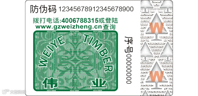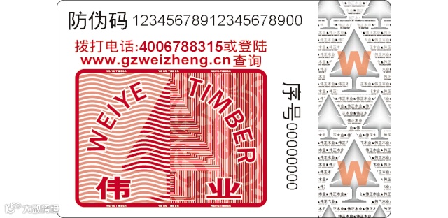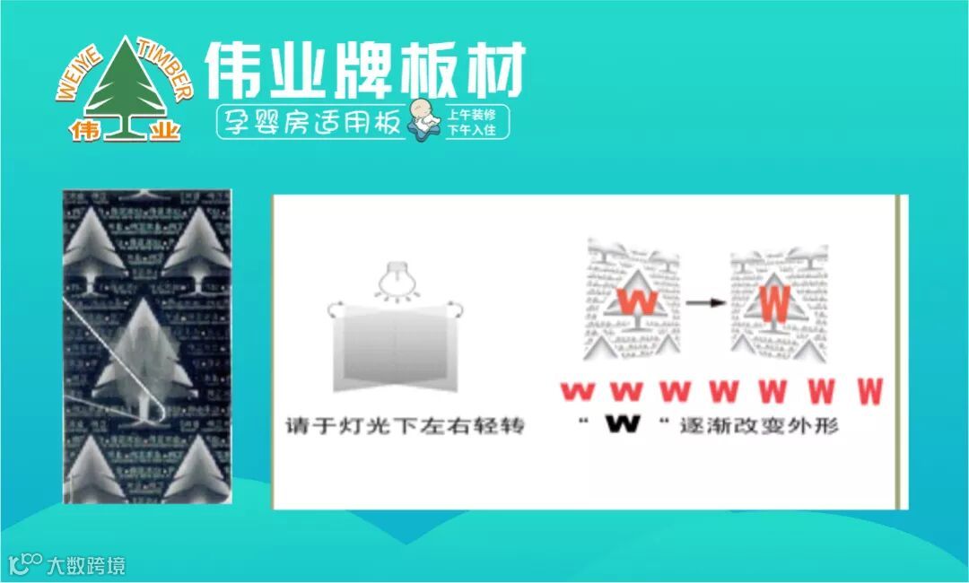(2)此处为镭射图案,“W”字母会随着观看角度“长高”和“变矮”,在灯光下更为明显;用放大镜观看,出现许多“伟正木业”的字样;