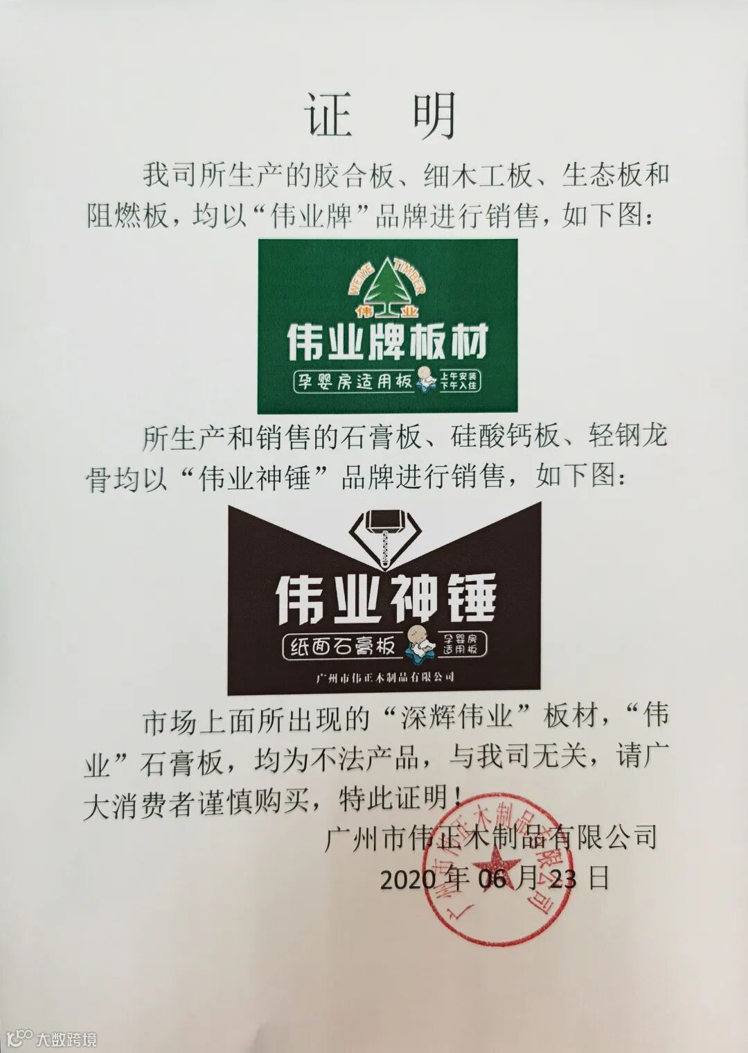 近日,市场中出现了假冒“伟业牌”、“伟业神锤”的产品,严重危害消费者的权益和伟正木业的品牌形象,现作以下证明: