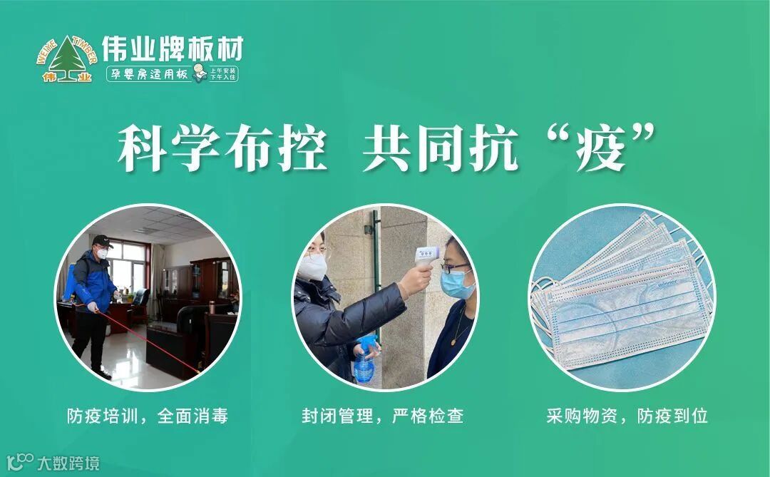 突如其来的新冠肺炎让人猝不及防,自全国总动员战“疫”打响以来,全民万众一心奋战在各自岗位上,为抗击疫情全力以赴,疫情就是命令,防控就是责任,助力国家打赢战疫防控战是伟业牌板材义不容辞的义务和责任!