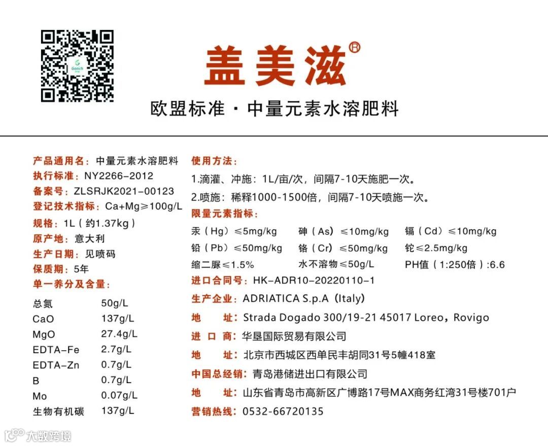 盖美滋®是钙、镁浓缩液与生物有机碳和螯合态微量元素,经特殊工艺并添加了独特的助剂调配而成的水溶性叶面肥,本品含钙量高,易吸收,能够快速为作物补充钙元素,并且能够防治作物由于缺钙、镁或微量元素引起的各类生理病害。使用本品后可促使作物生长健壮、增强作物抗逆性、增加产量、提高品质。