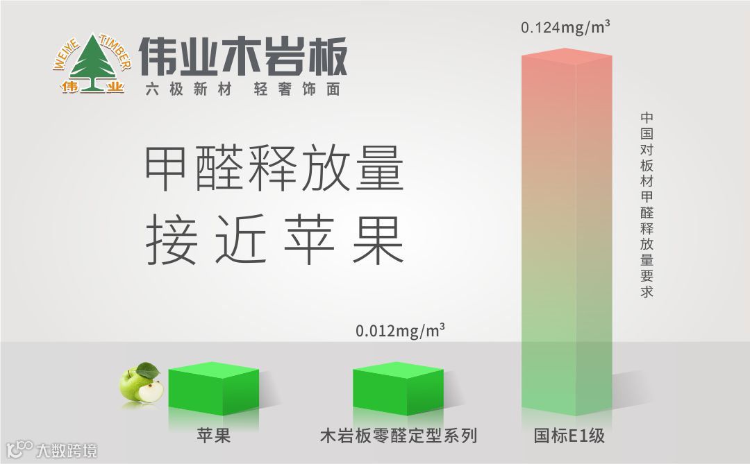 在板材行业,高毒性的甲醛是影响产品环保的主要因素,令人谈“醛”色变。“六极新材,轻奢饰面”的伟业木岩板,经广州质量监督检测研究院检验,甲醛释放量≤0.012mg/m³,接近苹果的甲醛释放量,远超国家标准,刷新板材行业环保新标准。
