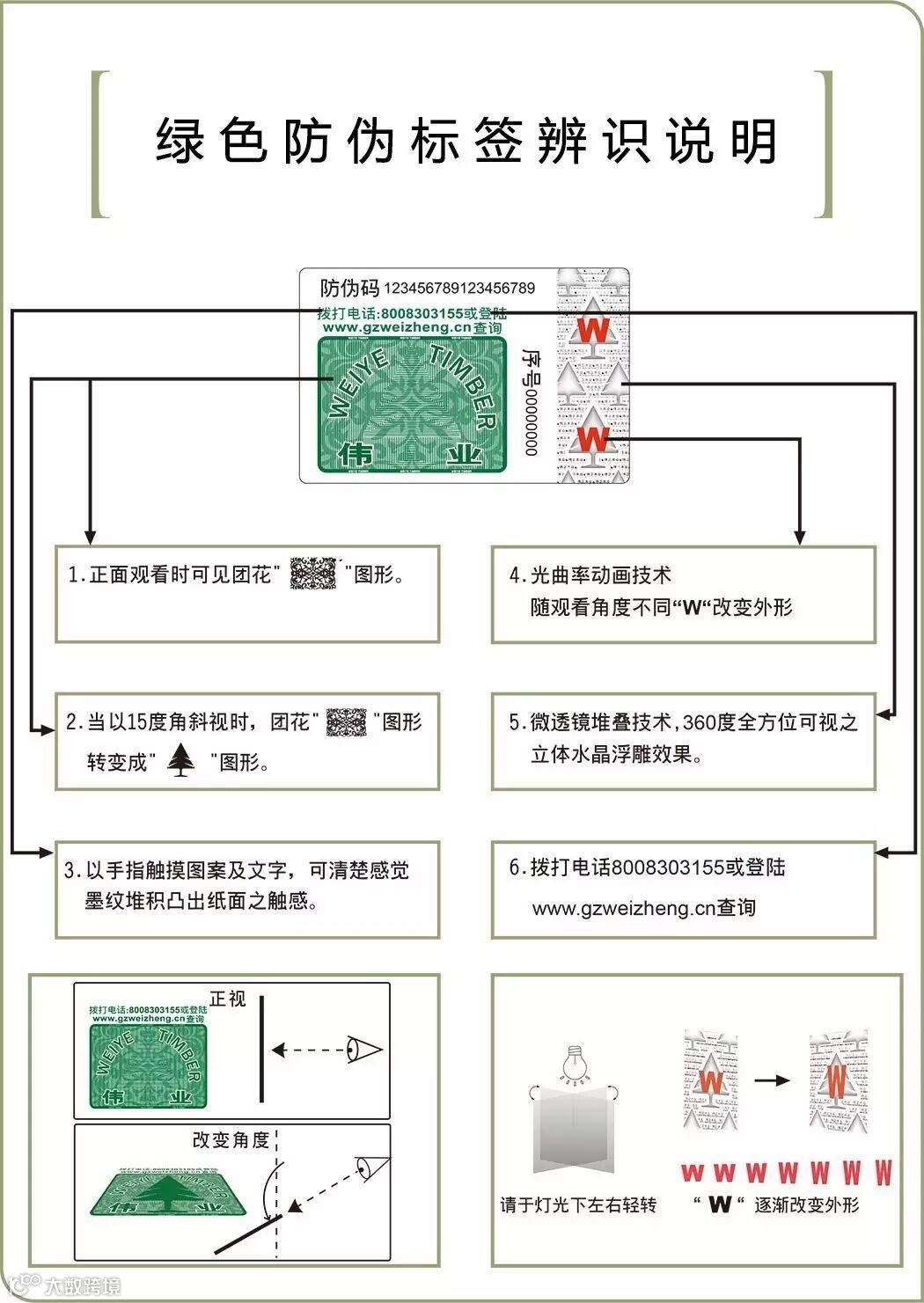 最近,收到可靠线报,市场上出现绿色的假防伪标签!看来假冒商品从最初的仿板材构造已经发展到连防伪标签都仿冒了!在此,小编向各位奉上一张简易的说明图,简单学会辨别防伪标签。