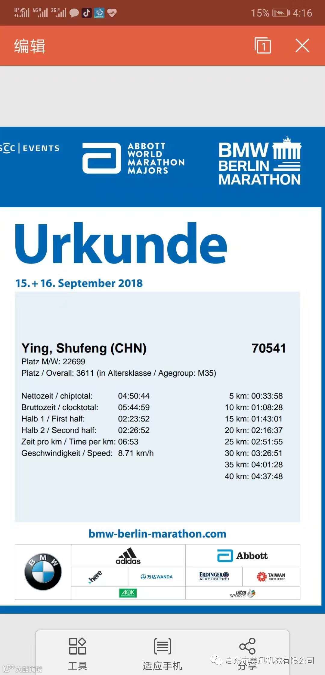 中国包装联合会成员应树丰董事长代表美迅蜂窝机械机械出征柏林马拉松!