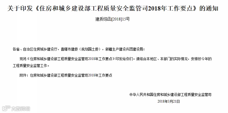 住建部于2018年3月26日下发《住房和城乡建设部工程质量安全监管司2018年工作要点》,其中明确提出:“严格落实各方主体责任,强化建设单位首要责任,全面落实质量终身责任制”。