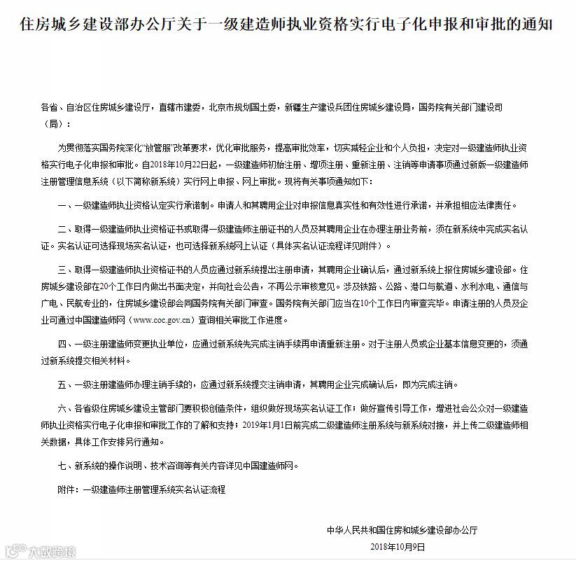 《关于进一步推行一级注册建筑师电子化注册管理工作的通知》中规定,自2018年1月1日起,一级注册建筑师实行网上申报。初始注册、延续注册、变更注册等,须通过“全国一级注册建筑师、注册工程师注册管理信息系统” 进行网上申报,不再提交纸质材料。接下来,相信纸质建造师证书的废除也将在不久之后。