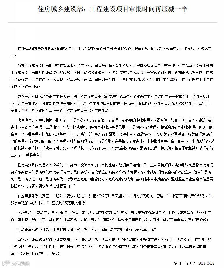 这项举措无疑推动了政府职能转向减审批、强监管、优服务,促进了市场的公平竞争;对于施工企业而言,将工程建设项目审批时间再压减一半会帮助工程项目的进度、效率都有所提升。