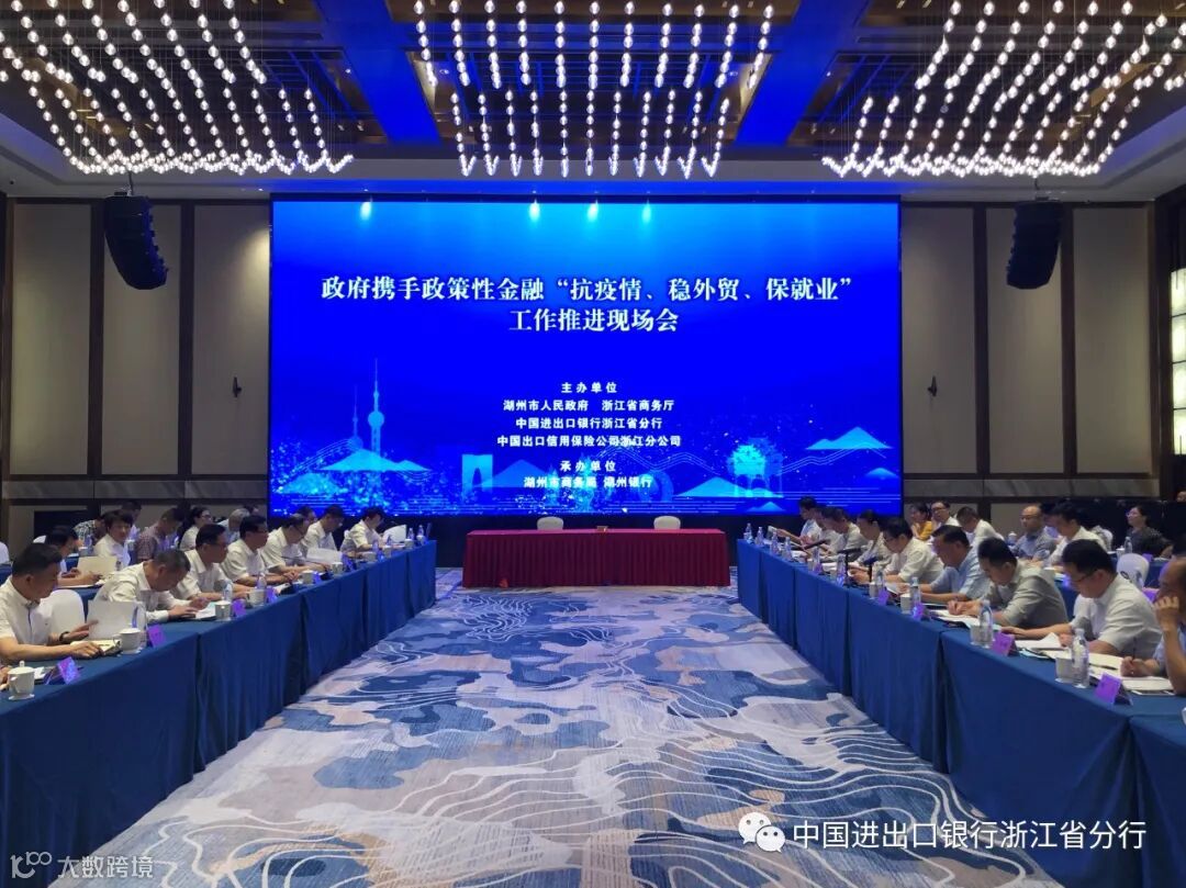 2020年6月11日下午,湖州市人民政府、浙江省商务厅、中国进出口银行浙江省分行、中国出口信用保险公司浙江分公司在湖州市联合主办了“政府携手政策性金融‘抗疫情、稳外贸、保就业’工作推进现场会”。会上,进出口银行浙江省分行、省商务厅对外贸易服务中心、浙江信保分别和湖州银行签署了支持“订单+清单”小微企业《转贷款借款合同》《合作协议》和《三方赔款权益转让合同》,湖州银行和小微企业代表签署了相关《借款合同》。这是政府、银行、保险三方进一步深化合作,借助政府系统平台,充分发挥政策性融资和出口信用保险服务优势,共同为企业提供优质、高效服务,全力推动落实“六稳”“六保”工作的重要举措。