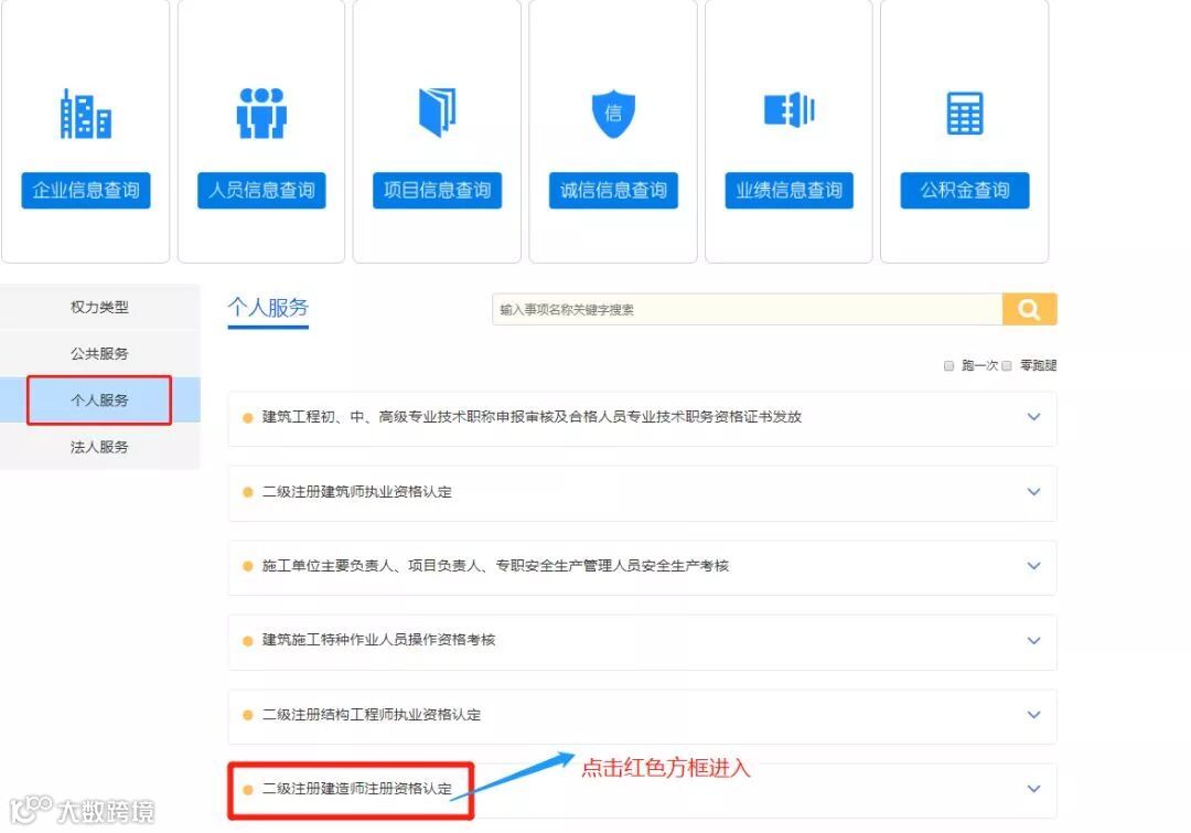 进入“个人服务”后,选择中间列表中的“二级注册建造师注册资格认定”。如下图: