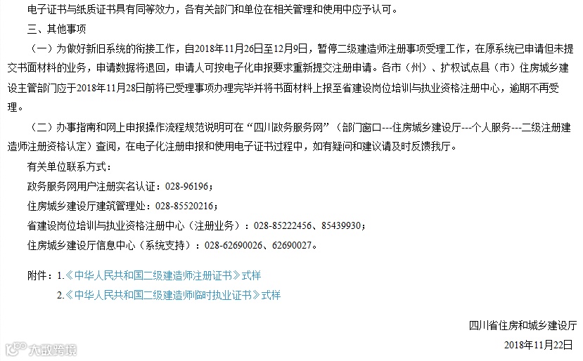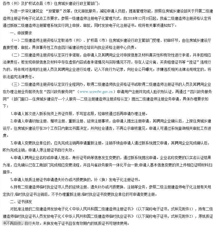 自2018年12月10日起,四川省二级建造师注册资格认定将通过新版二级建造师注册管理系统实行网上申报、审批,同时发放电子化注册证书。