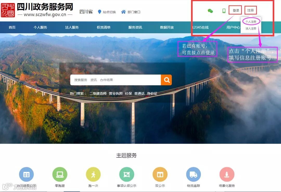 二级建造师在办理注册业务前须先在登录“四川政务服务网”(www.sczwfw.gov.cn)申请用户注册。之前已有账号可直接登录,若无则须通过手机号办理注册。如下图: