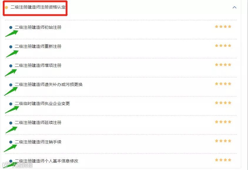 在“二级注册建造师注册资格认定”下拉列表中选择对应的注册类别进入。如下图: