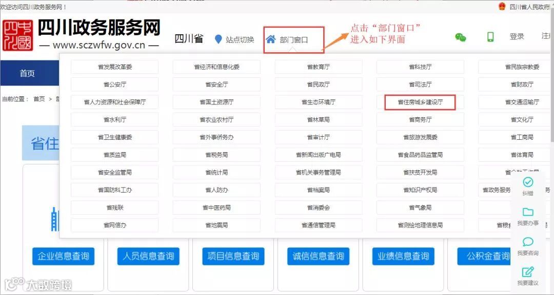 登录后,在顶端点击“部门窗口”进入“省住房城乡建设厅”如下图:
