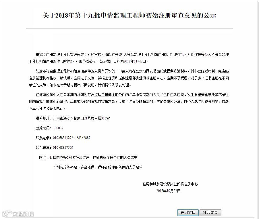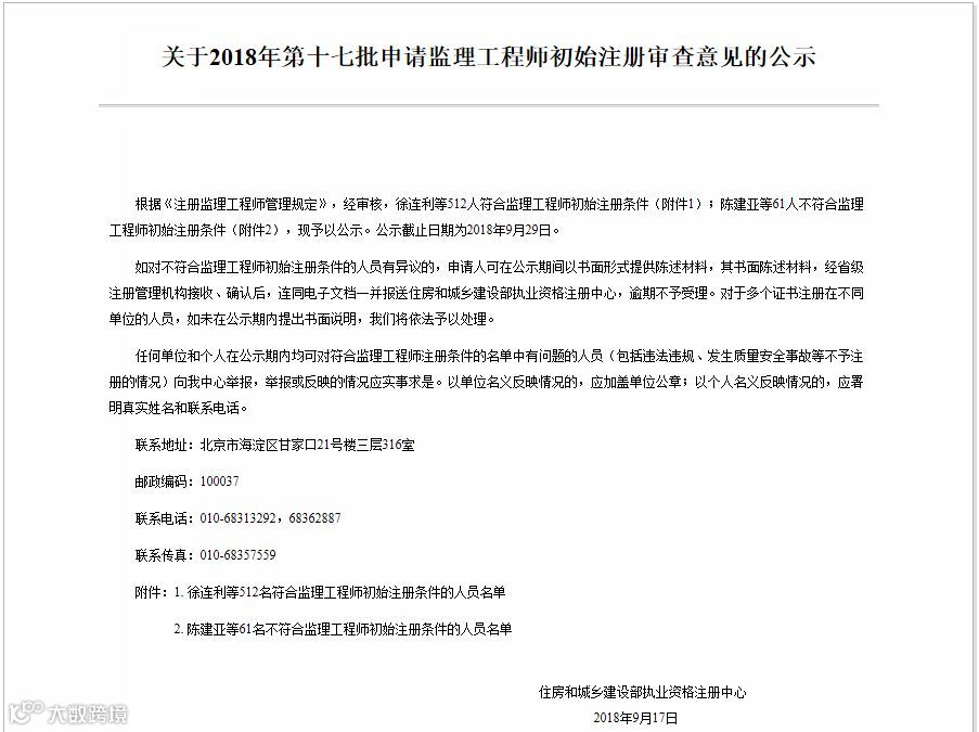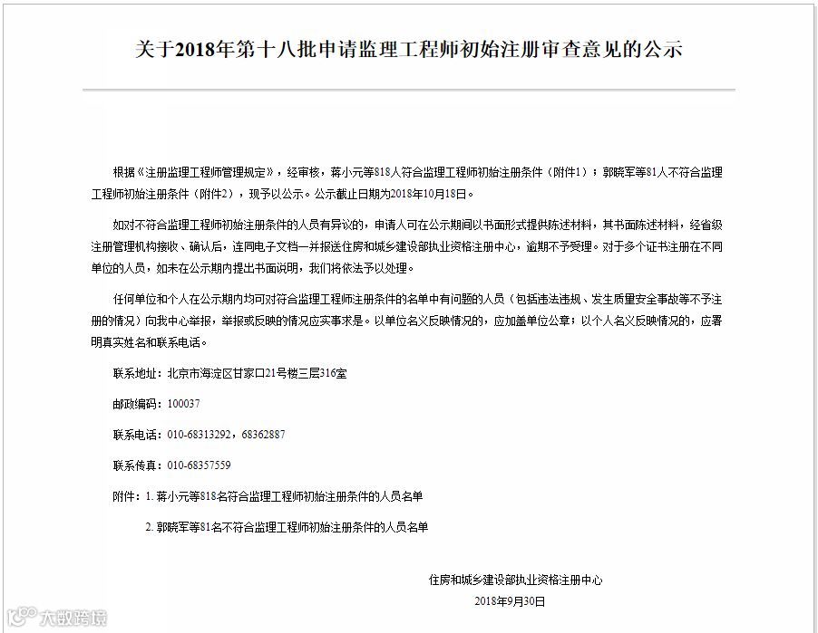 9月17日—10月22日,住建部陆续公布了《关于2018年度第十七批申请监理工程师初始注册审查意见的公示》、《关于2018年度第十八批申请监理工程师初始注册审查意见的公示》、《关于2018年度第十九批申请监理工程师初始注册审查意见的公示》。
