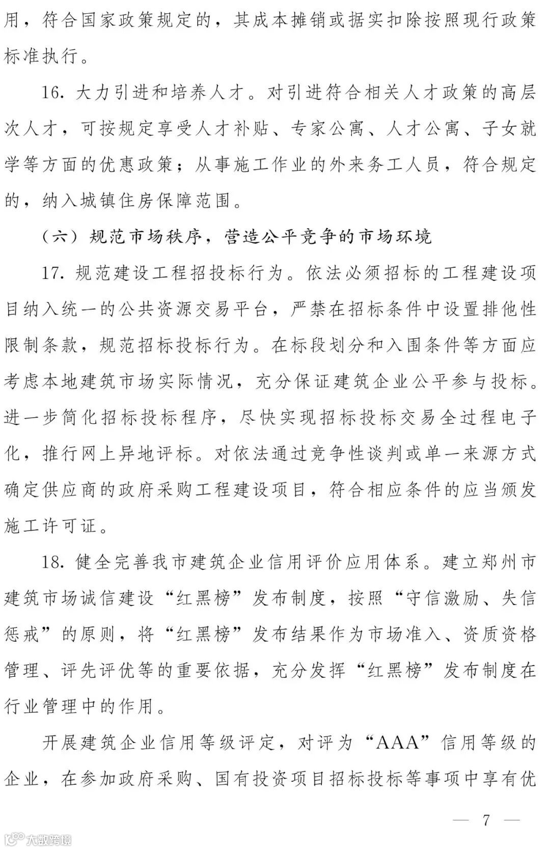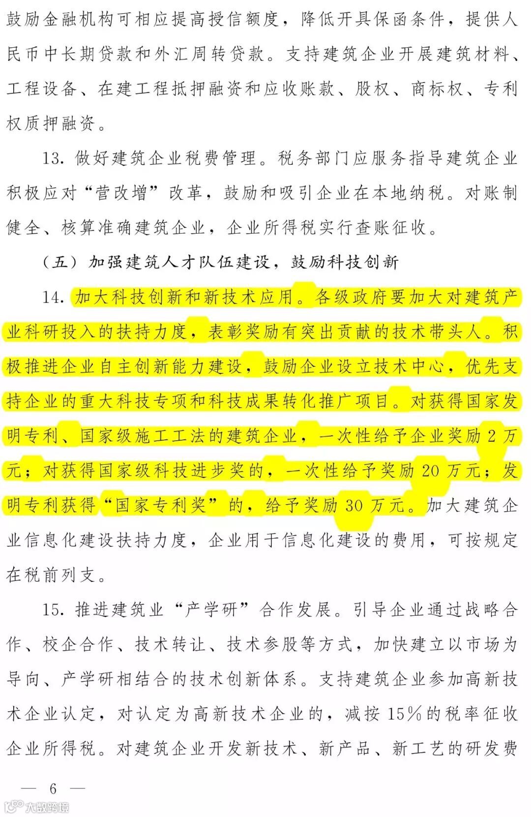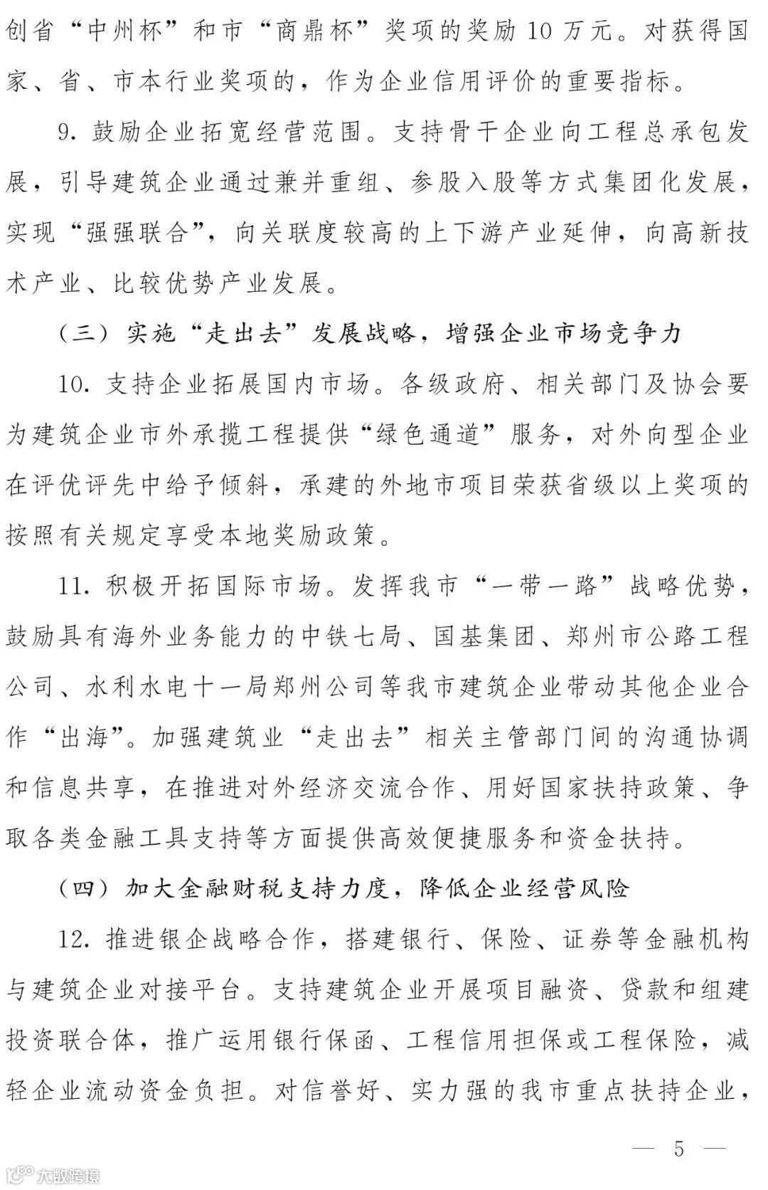 第三部分:主要政策内容。共6部分18条。其中第一部分是“强化政府引导,推进建筑业转型升级”,共3条;第二部分是“优化产业结构,扶持优秀企业做大作强”,共6条;第三部分是“实施“走出去”发展战略,增强企业市场竞争力”,共2条;第四部分是“加大金融财税支持力度,降低企业经营风险”,共2条;第五部分是“加强建筑人才队伍建设,鼓励科技创新”,共计3条;第六部分是“规范市场秩序,营造公平竞争的市场环境”,共计2条。