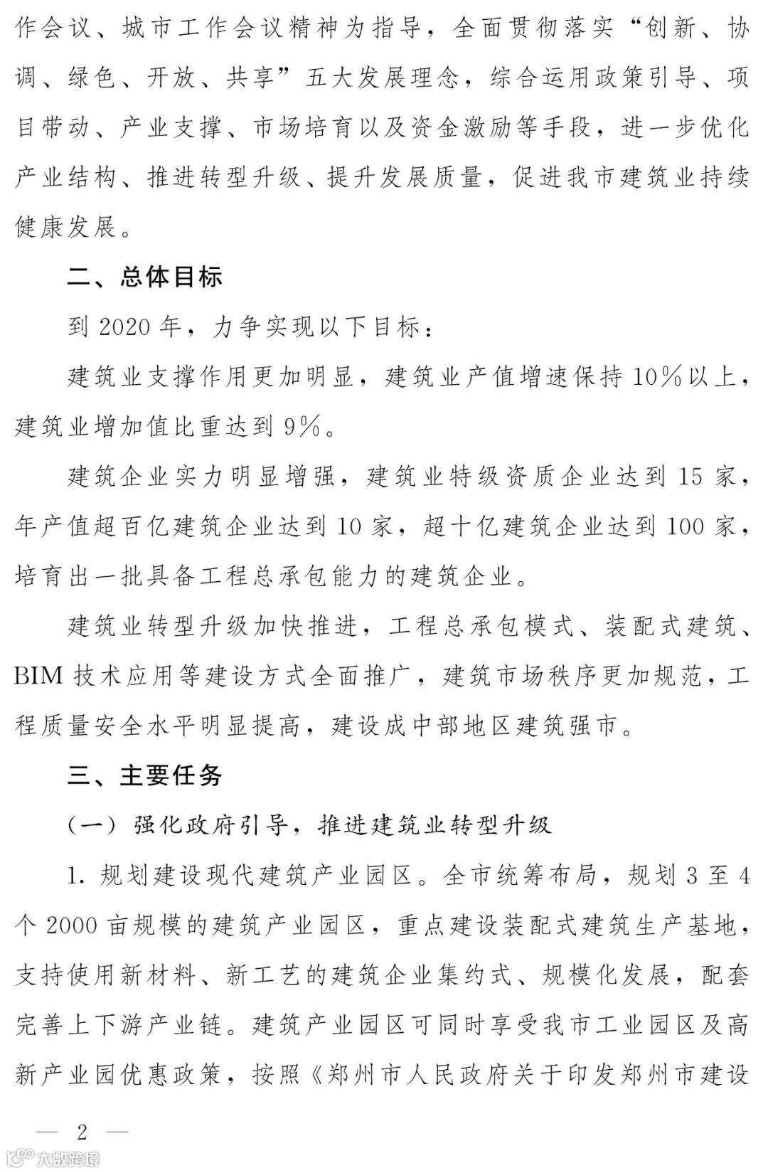 第二部分:总体目标。力争到2020年,实现三大目标:一是建筑业产值目标,建筑业产值增速保持10%以上,建筑业增加值比重达到9%;二是建筑企业做大做强,特级资质企业达到15家,年产值超百亿建筑企业达到10家,超十亿建筑企业达到100家;三是实现建筑业转型升级,工程总承包模式、装配式建筑、BIM技术应用等建设方式全面推广,建筑市场秩序更加规范,工程质量安全水平明显提高,建设成中部地区建筑强市。