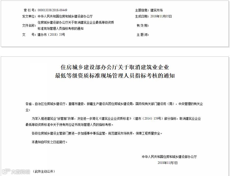 为深入推进建筑业“放管服”改革,决定进一步简化《建筑业企业资质标准》(建市〔2014〕159号)部分指标,取消建筑业企业最低等级资质标准中关于持有岗位证书现场管理人员的指标考核。