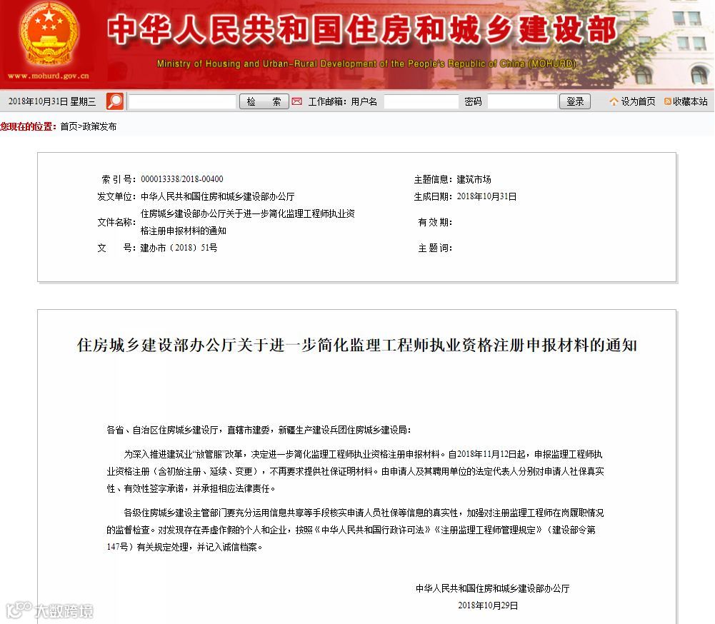 为深入推进建筑业“放管服”改革,决定进一步简化监理工程师执业资格注册申报材料。 自2018年11月12日起,申报监理工程师执业资格注册(含初始注册、延续、变更),不再要求提供社保证明材料。由申请人及其聘用单位的法定代表人分别对申请人社保真实性、有效性签字承诺,并承担相应法律责任。