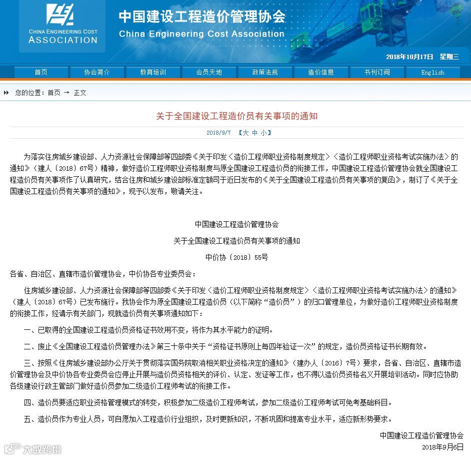住房城乡建设部、人力资源社会保障部等四部委《关于印发〈造价工程师职业资格制度规定〉〈造价工程师职业资格考试实施办法〉的通知》(建人〔2018〕67号)已发布施行。我协会作为原全国建设工程造价员(以下简称“造价员”)的归口管理单位,为做好造价工程师职业资格制度的衔接工作,经请示有关部门,现就造价员有关事项通知如下: