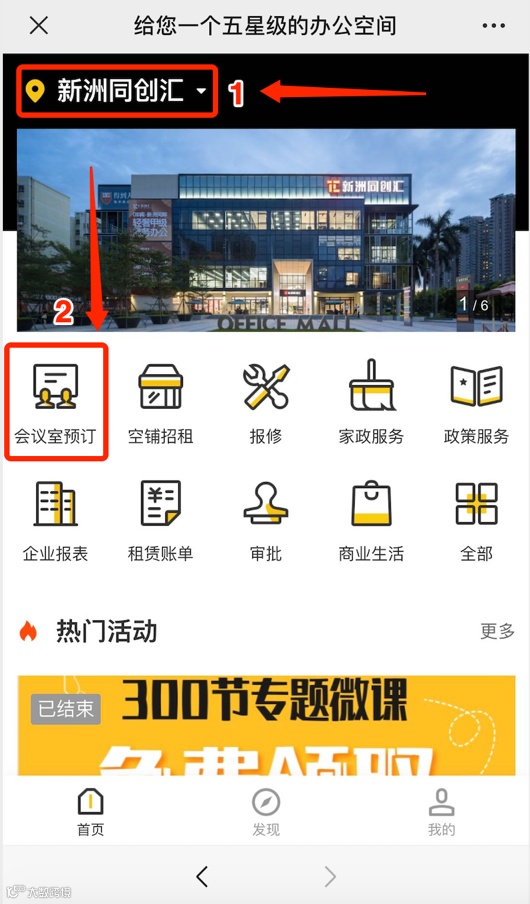 关注“同创荟”平台,点击“同创荟”,进入之后选择“新洲同创汇”/“振业同创汇”/“星港同创汇”,选定园区后再点击“会议室预订”即可预订会议室(见下图)。