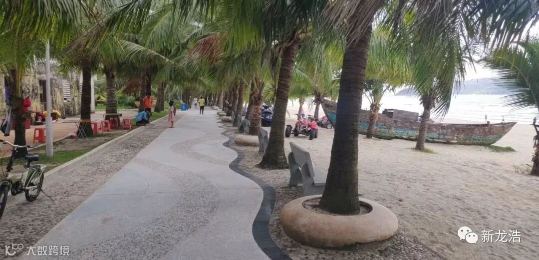 路依海滨而建,有一排排葱郁的椰林。路宽径幽,蜿蜒在浓荫密布的椰林中,椰叶婆娑如撑开的绿伞,为情侣们遮阳盖光。椰林海浪,倾听了数不清的激情浪漫的故事。