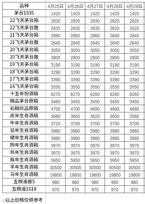 今日(4月29日),从网络发布的白酒价格行情监测数据显示,这几天茅台多款酒的售价下跌中。