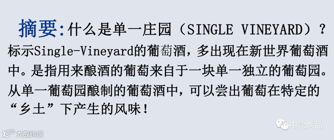 由于新世界很多葡萄酒的葡萄来源很广,甚至酒款中的一个葡萄品种会来源几个产地,就算是来源于1个产区,往往跨越也是很大,可能由几个葡萄园供给!
