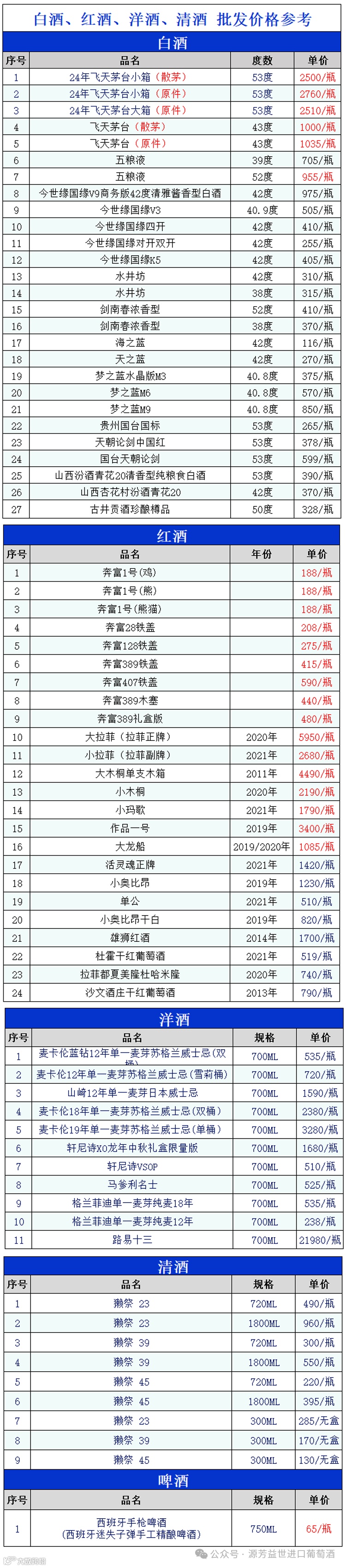 今日(8月09日),依照网络及市场调研的价格行情监测数据,整理酒类行货价格成下表给大家参考。