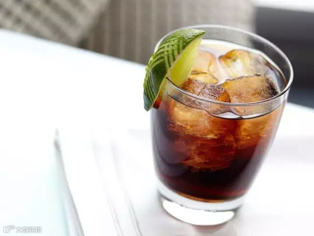 3、加可乐:可乐倒入放冰块的朗姆酒中,再加一点橙汁。
