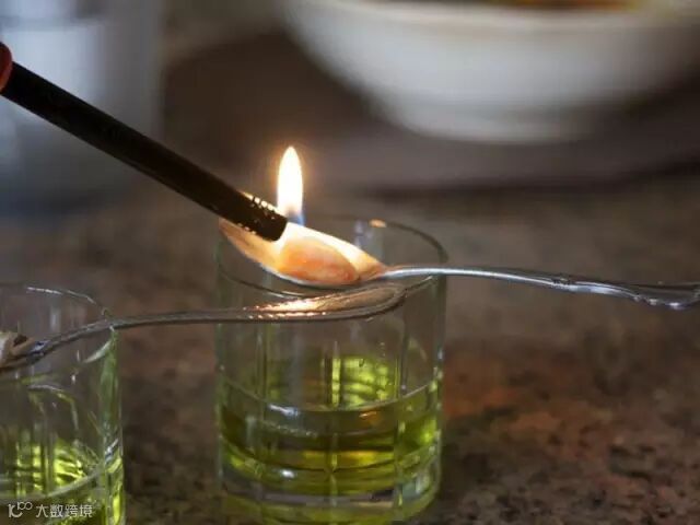 4、波西米亚饮法:把苦艾酒勺子放在杯子上,上面放一小块方糖,将糖点燃,等变成褐色焦糖后,将融化的糖汁倒入杯中并搅拌,再加矿泉水。